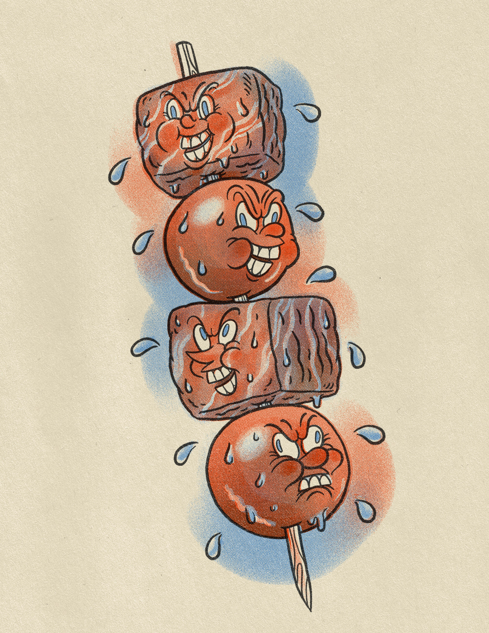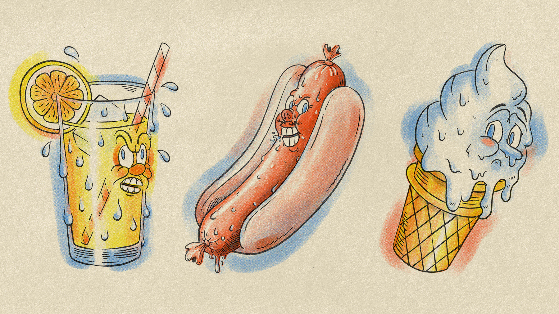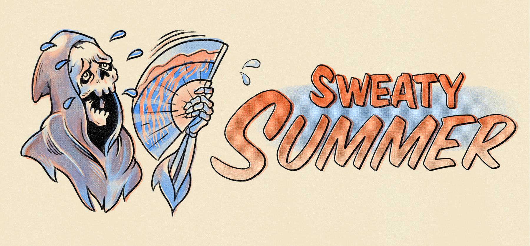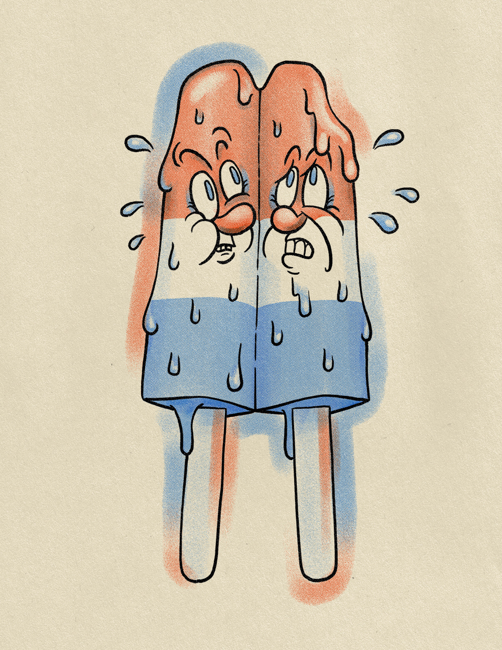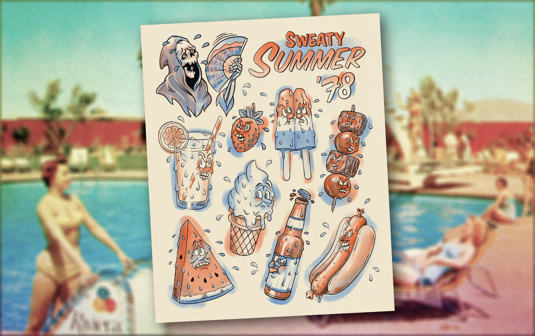 Born from a broken A/C and a melted brain comes this rag tag crew of sweaty, heat stroked summer foods. The dog days of summer 2019 were so hot, I had to draw some icy treats just to cool off. Global warming, amirite? A throwback to the days when happiness was short-shorts and melted ice cream dripping down your face, these frosty dudes are colored using halftones and printed on a Risograph for supreme vintage vibes.